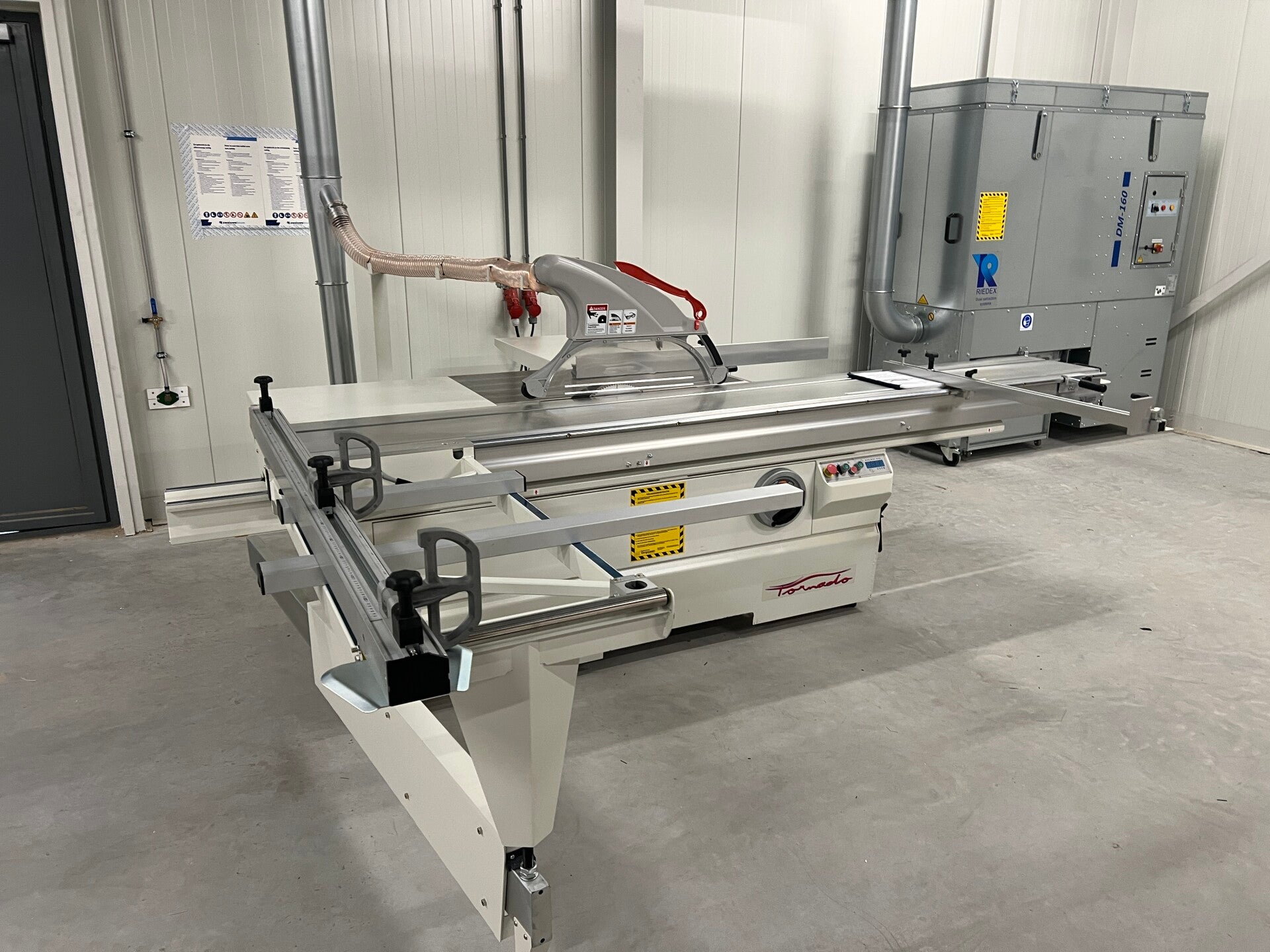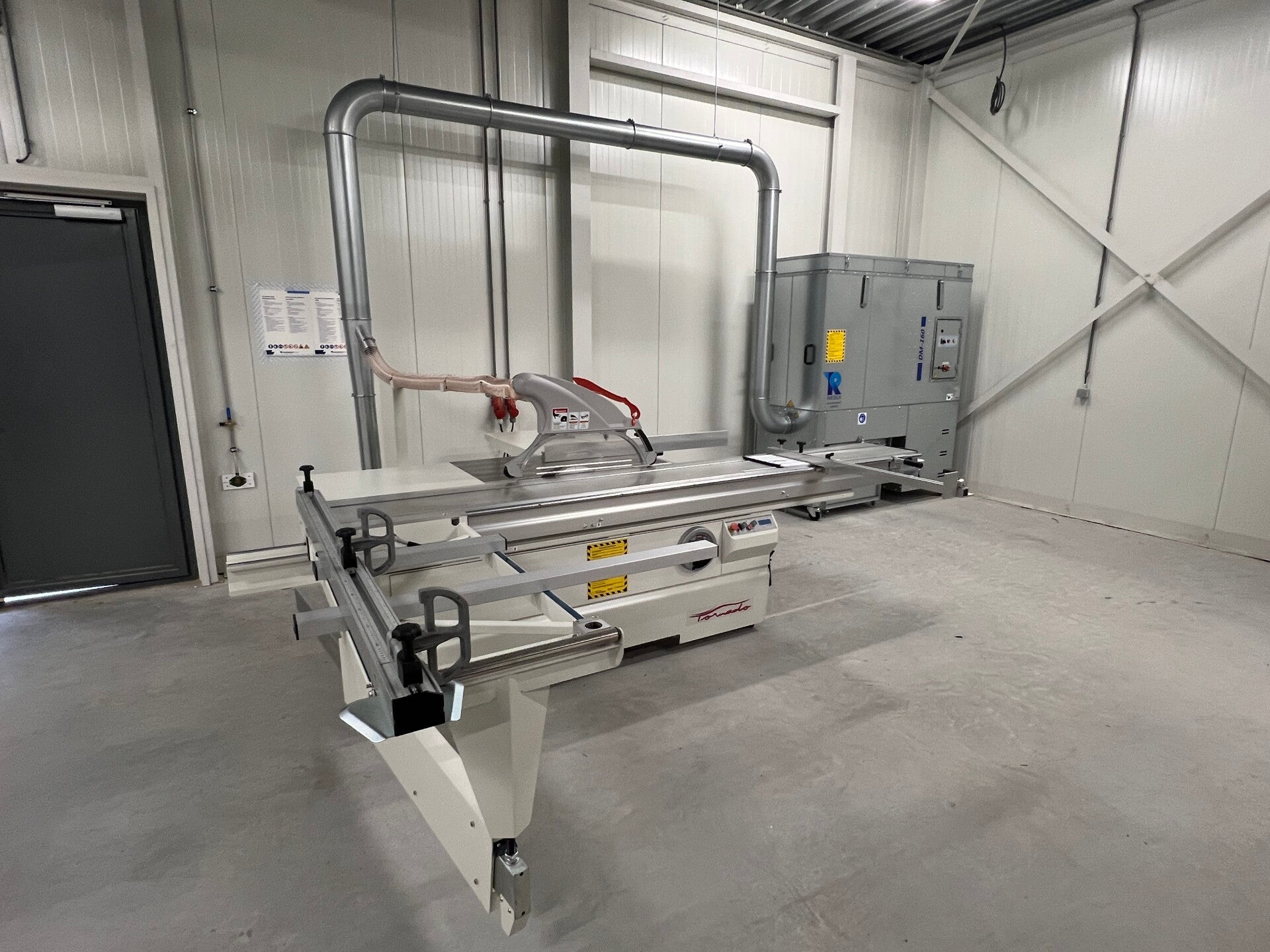 Machine is standaard voorzien van een ontdubbelde start/stop schakelaar en kan zowel aan de voorzijde worden opgestart (voor het zagen van grote platen) als aan de achterkant van de rolwagen, ter hoogte van de zijgeleider (gebruikt bij zagen van massief op zijgeleider)